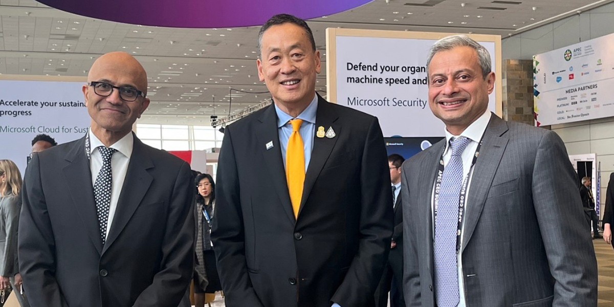 นายเศรษฐา ทวีสิน นายกรัฐมนตรี (กลาง) พร้อมด้วยนายสัตยา นาเดลลา ซีอีโอของไมโครซอฟท์ (ซ้าย) และนายอาเหม็ด มาซารี ประธาน ไมโครซอฟท์ เอเชีย (ขวา)
