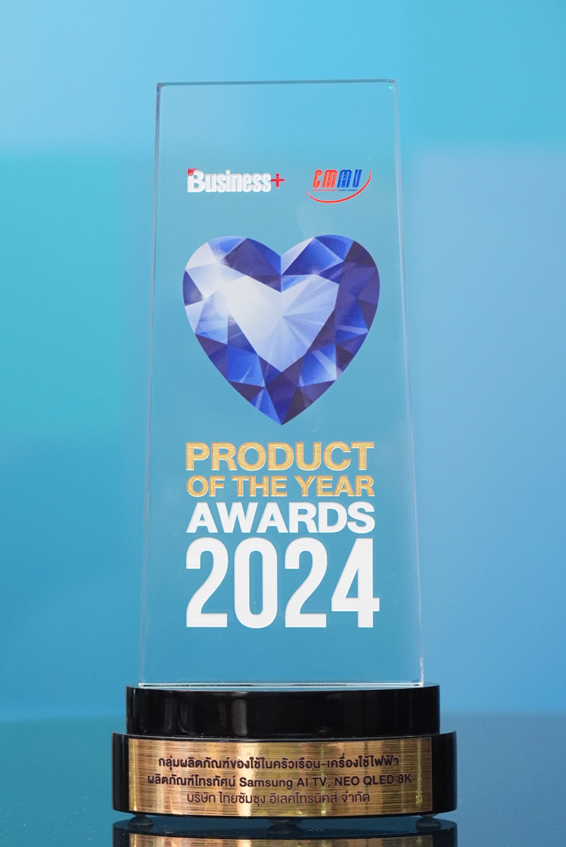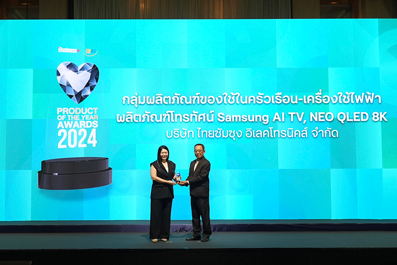 ซัมซุง ตอกย้ำความเป็นผู้นำเทคโนโลยีและนวัตกรรมระดับโลก คว้ารางวัล BUSINESS+ PRODUCT OF THE YEAR AWARDS 2024 ในหมวดผลิตภัณฑ์ของใช้ในครัวเรือน-เครื่องใช้ไฟฟ้า จากผลิตภัณฑ์ Samsung AI TV, Neo QLED 8K โดยมี คุณชารียา เข็มทอง ผู้จัดการผลิตภัณฑ์ ธุรกิจอุปกรณ์ภาพและเสียง บริษัท ไทยซัมซุง อิเลคโทรนิคส์ จำกัด เป็นผู้รับรางวัล