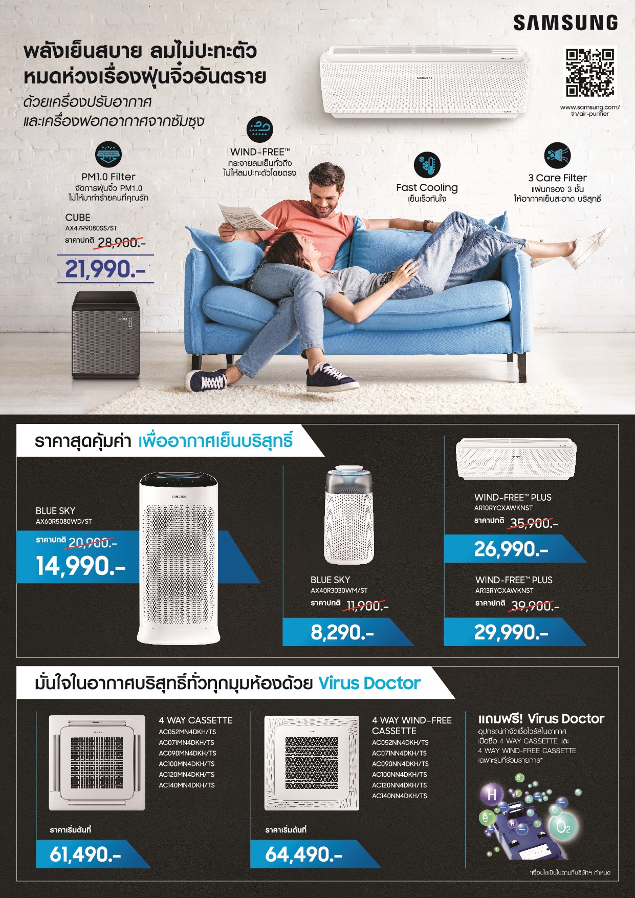 สำหรับผู้ที่สนใจสามารถพบกับโปรโมชั่น “Bring Back Clean Air” มอบอากาศเย็นบริสุทธิ์แก่บ้านของคุณด้วยราคาสุดพิเศษสำหรับเครื่องปรับอากาศและเครื่องฟอกอากาศ สูงสุด 30% และพิเศษ เมื่อซื้อเครื่องปรับอากาศแบบฝังฝ้า 4 ทิศทาง แถมฟรี Virus doctor ได้ที่ shop.samsung.com/th/offer/bringbackcleanair ตั้งแต่วันที่ 11 มกราคม 2563 – 29 กุมภาพันธ์ 2563 นี้