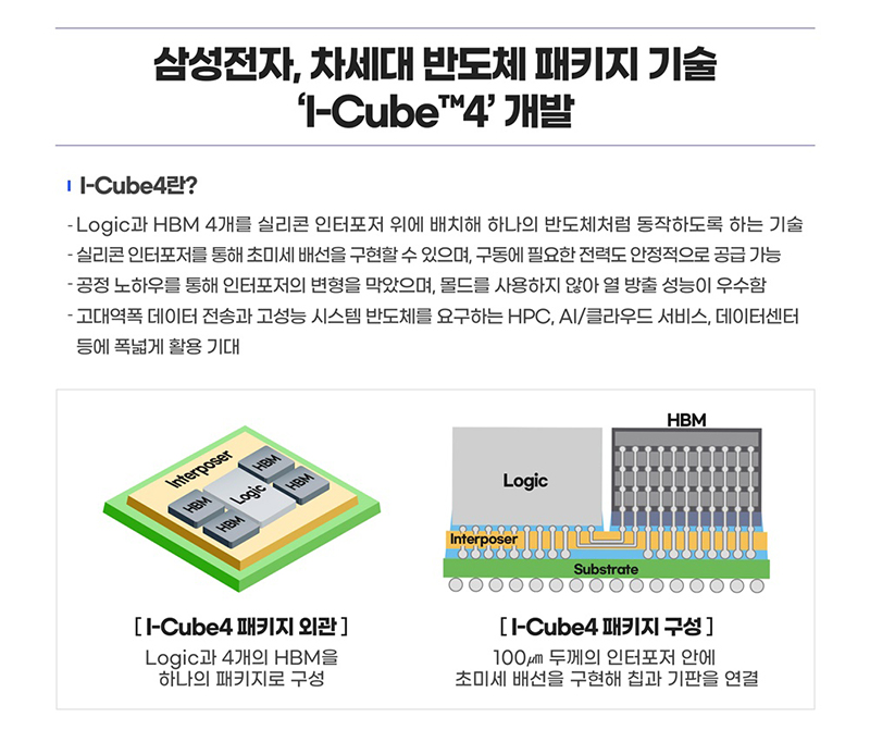 โดย I-Cube4 เป็นนวัตกรรมบรรจุภัณฑ์ชิปที่ใช้การวางผังตำแหน่งของเหล่าหน่วยประมวลผลต่าง ๆ เช่น CPU, GPU และ NPU ในรูปแบบแนวนอนบน Interposer ซิลิกอน ซึ่งการจัดเรียงที่เป็นระบบแบบนี้ จะทำให้ตัวชิปสามารถทํางานได้หลากหลาย และรวดเร็วยิ่งขึ้นกว่าเดิมภายใต้การทำงานด้วยชิปตัวเดียวเท่านั้น ไม่ต้องแยกเหมือนปัจจุบัน และมีความเป็นไปได้ว่าจะสามารถนำมาปรับใช้กับเทคโนโลยี 5G และเทคโนโลยีคลาวด์, AI และแอปพลิเคชั่นต่าง ๆ ที่ต้องการเซมิคอนดักเตอร์ที่รวดเร็วมากได้หลากหลาย