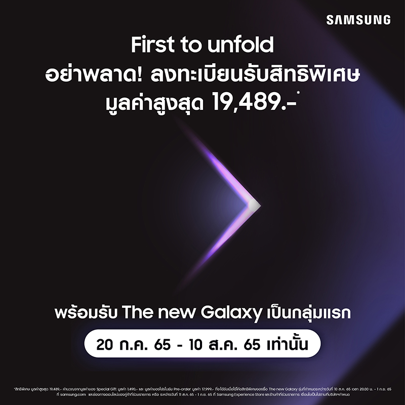 ซัมซุงจัดแคมเปญ “First to unfold” ต้อนรับการเปิดตัว The new Galaxy ก่อนใคร ลงทะเบียนเพื่อเป็นกลุ่มแรกที่สัมผัสประสบการณ์ใหม่กับสิ่งที่เป็นมากกว่าสมาร์ทโฟน พร้อมรับสิทธิพิเศษมูลค่าสูงสุดกว่า 19,489.- บาท อีกทั้งยังสามารถลุ้นรับของรางวัลมูลค่ามากกว่า 300,000.- เมื่อชวนเพื่อนมาลงร่วมทะเบียนรับสิทธิพิเศษด้วยกัน