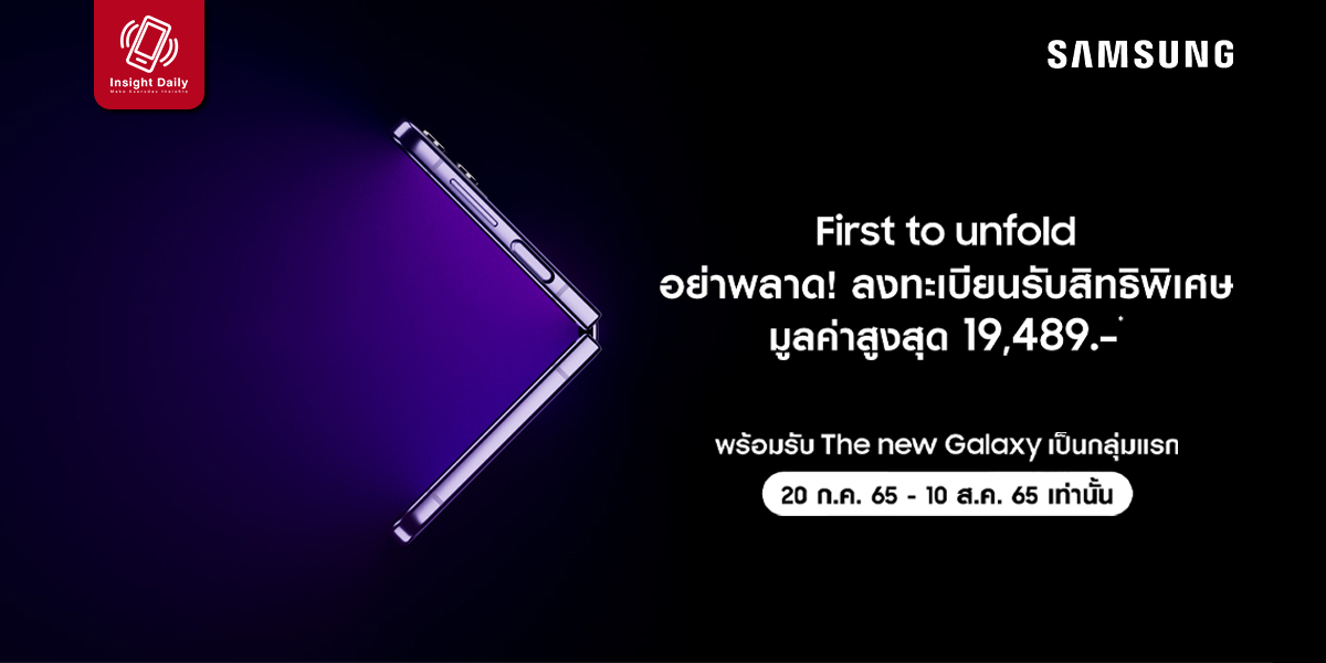 เตรียมพบกับประสบการณ์ใหม่ สมาร์ทโฟนที่เป็นได้มากกว่า วันนี้ซัมซุงพร้อมส่งมอบสิทธิพิเศษมากถึง 3 ต่อ โดยผู้ที่ลงทะเบียนในแคมเปญ “First to unfold” จะได้รับข้อเสนอพิเศษ ดังนี้ (1) รับสมาร์ทโฟน The new Galaxy เป็นกลุ่มแรก (2) รับโปรโมชั่น Pre-order มูลค่าสูงสุด 17,999.-* (3) ฟรี Special Gift มูลค่าสูงสุด 1,490.-* เมื่อนำโค้ดสิทธิพิเศษมาใช้ซื้อ The new Galaxy สำหรับผู้ที่สนใจสามารถลงทะเบียนเพื่อรับข้อเสนอพิเศษได้ผ่านทาง bit.ly/SAMSUNGunpacked ตั้งแต่วันนี้ – 10 สิงหาคม 2565 เวลา 23.59 น. เท่านั้น