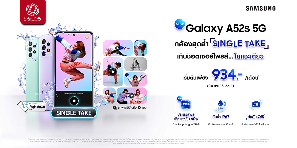 เปิดตัวสมาชิกใหม่ล่าสุด Samsung Galaxy A52s 5G สมาร์ทโฟนที่ตอบโจทย์ทุกมิติของการทำคอนเทนต์อย่างแท้จริง นำโดยฟีเจอร์กล้องสุดล้ำอย่าง Single Take ที่สามารถเก็บครบทุกโมเมนต์พิเศษได้ในช็อตเดียว พร้อมอัดแน่นเทคโนโลยีระดับพรีเมียมมากมาย ทั้งชิปเซ็ตใหม่ที่เร็วแรงกว่าเดิมถึง 60% ไปจนถึงประสิทธิภาพการกันน้ำและฝุ่น รวมถึงความสามารถอื่นๆ อีกมากมายที่ตอบรับ Insights ของผู้ใช้ Gen Z เรียกได้ว่า จบ ครบ ในเครื่องเดียว การันตีความคุ้มค่าที่สุดในตลาดสมาร์ทโฟนระดับราคา 13,999 บาท โดยมาพร้อมดีลพิเศษ กับราคาเริ่มต้นเพียง 934 บาทต่อเดือนเท่านั้น!