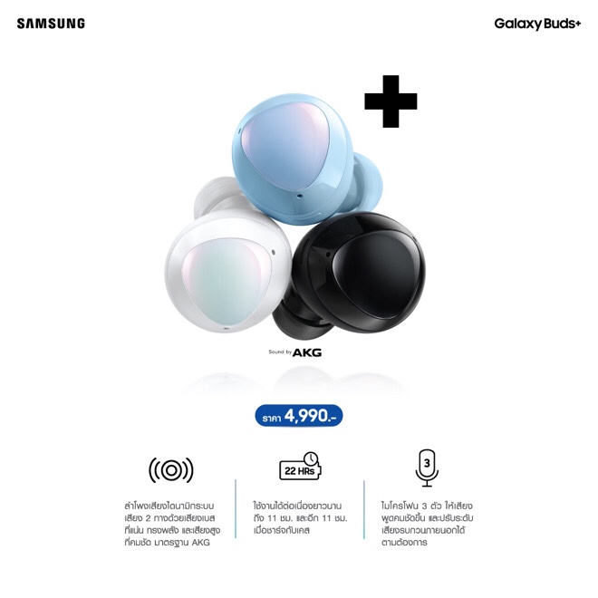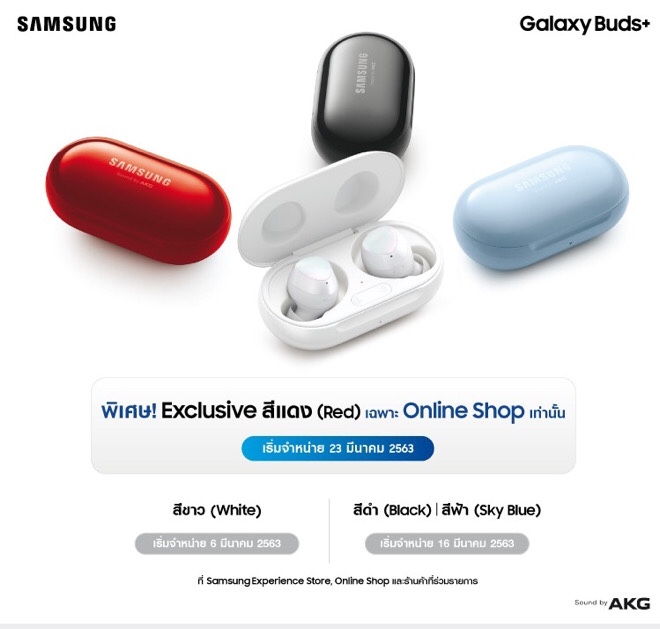 ซัมซุง เตรียมมอบประสบการณ์การฟังที่เหนือไปอีกขั้น ด้วย กาแลคซี่ บัดส์ พลัส (Galaxy Buds+) นวัตกรรมหูฟังไร้สายใหม่ล่าสุดที่ได้รับการออกแบบมาเพื่อให้ผู้ใช้ได้ดื่มด่ำกับการฟังเพลงและพอดแคสต์ที่ชื่นชอบได้อย่างเต็มอิ่ม ด้วยลำโพงไดนามิกระบบเสียง 2 ทาง มาตรฐาน AKG และเทคโนโลยีระบบไมโครโฟน 3 ตัวอันล้ำสมัย แบตเตอรี่ที่ใช้งานได้ต่อเนื่องยาวนาน โดยพร้อมให้ทุกคนเป็นเจ้าของ กาแลคซี่ บัดส์ พลัส รุ่นสีขาว (White) ได้ตั้งแต่วันที่ 6 มีนาคม 2563, สีดำ (Black) และสีฟ้า (Sky Blue) ได้ตั้งแต่ 16 มีนาคมนี้ และสีแดง (Red) ตั้งแต่ 23 มีนาคมนี้ ในราคาเพียง 4,990 บาท