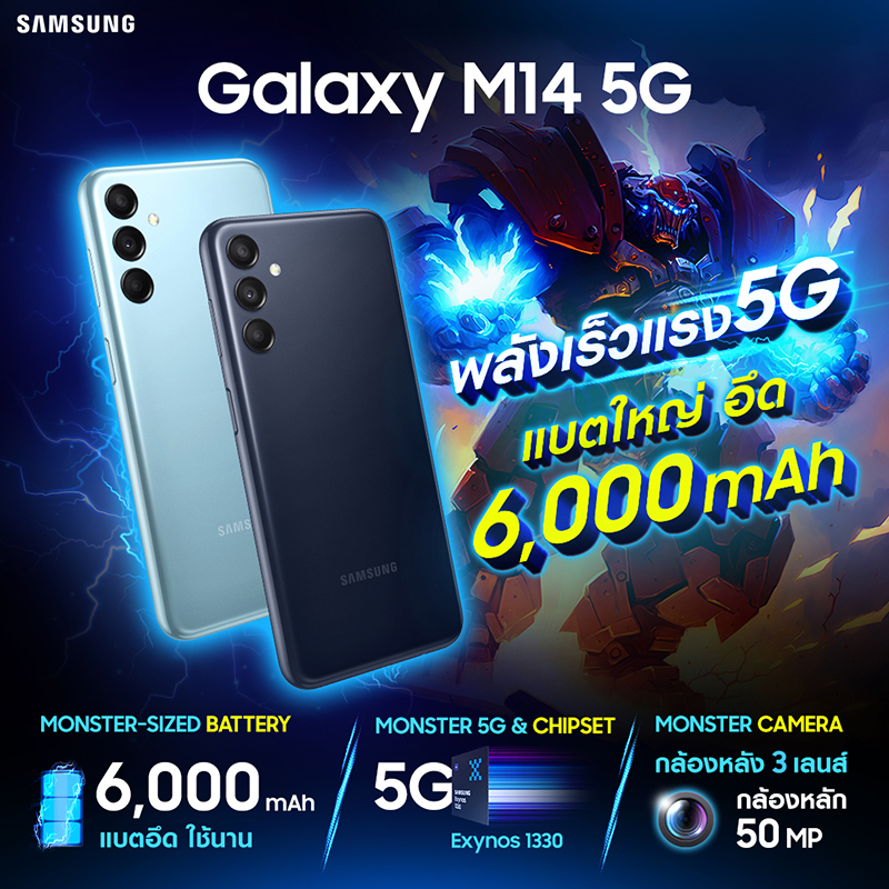 ซัมซุง เปิดตัว Monster ตัวใหม่ อย่าง Samsung Galaxy M14 5G สมาร์ทโฟนราคาเริ่มต้นสุดประหยัดที่มาพร้อมกับ แบตอึดถึง 6,000mAh ใช้งานได้ยาวนานไม่ขาดตอน มาพร้อมกับ 5G ที่เสริมพลังด้วยชิปเซ็ตประมวลผล Exynos1330 เร็วแรงสะใจ ใช้งานได้ไหลลื่นได้นาน ไม่มีสะดุดตอบโจทย์ทุกการใช้งาน ตอกย้ำความเป็น Monster ตัวใหม่ไม่แพ้ใคร กับ 4 พลัง Monster จัดเต็มจุใจในราคาที่คุ้มสุดๆ
