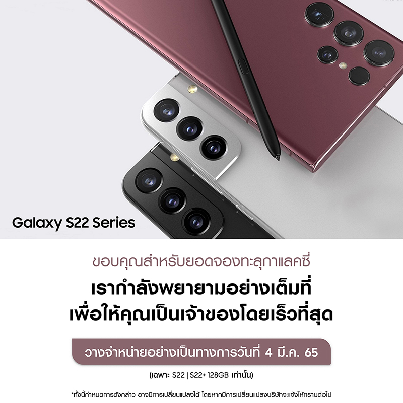 Galaxy S22 Series เปิดวางจำหน่ายอย่างเป็นทางการแล้วตั้งแต่วันนี้เป็นต้นไป สำหรับผู้ที่สนใจสามารถเข้าไปสัมผัสสมาร์ทโฟนยอดฮิตรุ่นนี้ได้ที่ Samsung Experience Store และร้านค้าที่ร่วมรายการ หรือสามารถติดตามรายละเอียดเพิ่มเติมได้ที่ www.samsung.com/th/smartphones/galaxy-s22-ultra/buy