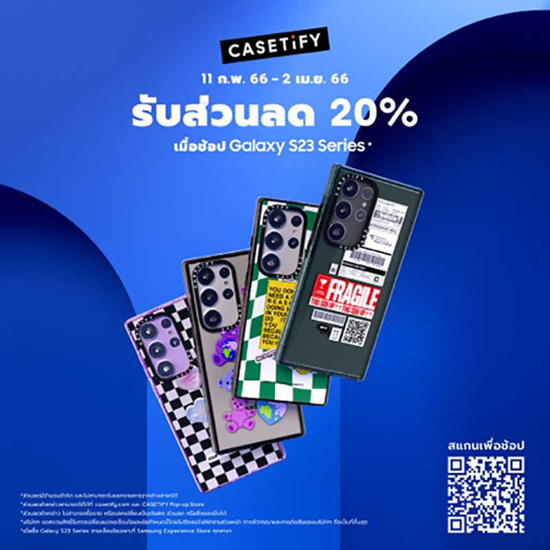 และพิเศษสุดพี๊คคค! ครั้งแรกในประเทศไทยเมื่อซัมซุงจับมือกับ CASETiFY แบรนด์เคสสมาร์ทโฟนสำหรับวัยรุ่น Gen Z มอบส่วนลด 20% ให้กับลูกค้าทุกคนที่ซื้อสมาร์ทโฟน Galaxy S23 Series ผ่าน Samsung Experience Store ภายใต้เงื่อนไขที่กำหนด โดยสามารถใช้ส่วนลดเพื่อซื้อเคสได้ ผ่าน casetify.com และ CASETiFY Pop-up Store เซ็นทรัลเวิลด์ ชั้น 1 โซน Atrium ตั้งแต่วันที่ 11 กุมภาพันธ์ – 31 มีนาคม 2566 นี้เท่านั้น