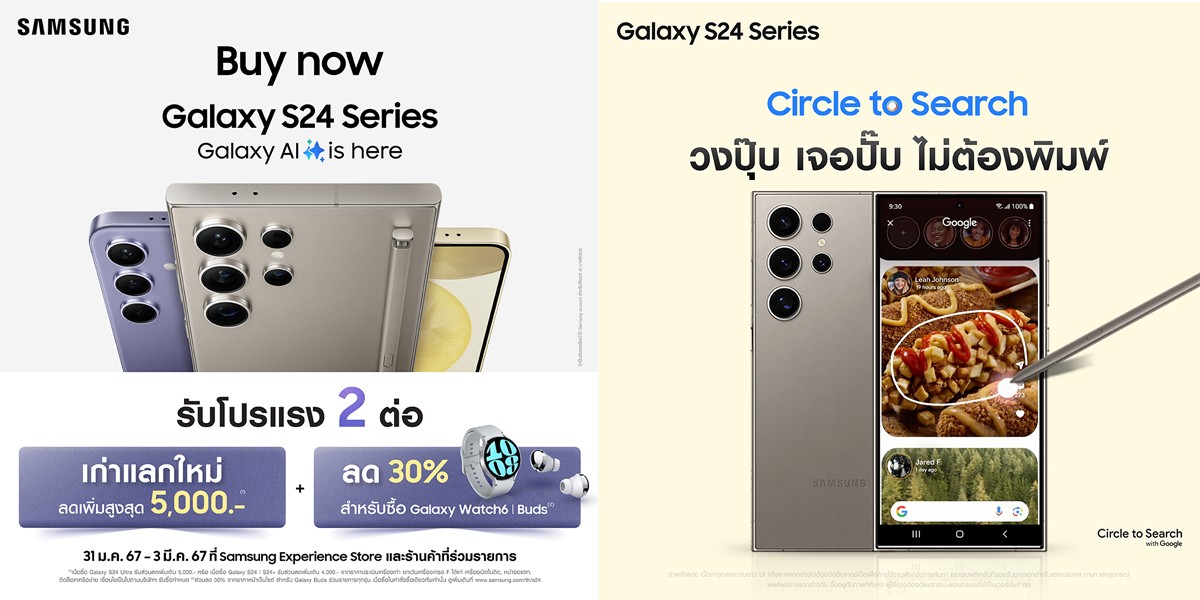 สำหรับรุ่น Galaxy S24 Ultra และสี Sapphire Blue, Sandstone Orange และ Jade Green สำหรับรุ่น Galaxy S24+ และ Galaxy S24 เปิดตัวมาอย่างปัง พร้อมโปรแรง 2 ต่อ ตั้งแต่วันนี้ถึง 3 มี.ค. 2567 ต่อที่ 1 เก่าแลกใหม่ ลดสูงสุด 5,000 บาท ต่อที่ 2 ลด 30% เมื่อซื้อ Galaxy Watch6 หรือ Galaxy Buds