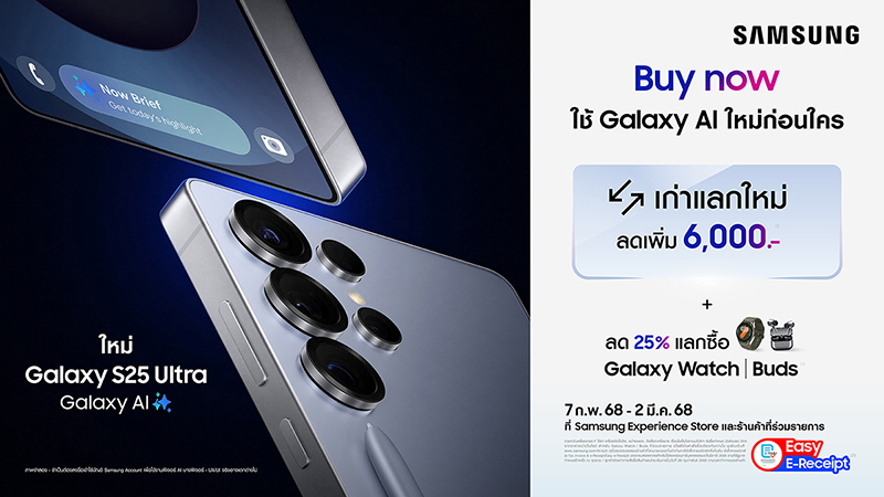 ซัมซุง ประกาศวางขาย Samsung Galaxy S25 Series อย่างเป็นทางการแล้วในประเทศไทย พร้อมมอบโปรโมชันฉลองการเปิดตัวผู้ช่วยคนใหม่ของคนไทย รับโปรฯ 2 ต่อ ซื้อตอนนี้ ใช้ Galaxy AI ก่อนใคร ตั้งแต่ 7 กุมภาพันธ์ – 2 มีนาคม 2568 นี้