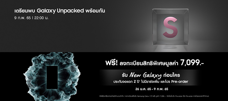 ซัมซุง อิเลคโทรนิคส์ ในฐานะผู้นำด้านนวัตกรรมและเทคโนโลยีระดับโลก พร้อมแล้วที่จะปฏิวัติอนาคตของวงการสมาร์ทโฟนและพาทุกคนมาพบกับมาตรฐานใหม่ของ The New Galaxy ที่โดดเด่นที่สุดเท่าที่เคยมีมา ในงาน Samsung Galaxy Unpacked ผ่านช่องทาง news.samsung.com/th หรือหากต้องการร่วมกิจกรรมไลฟ์เปิดตัวในประเทศไทย สามารถรับชมได้ผ่านทาง www.samsung.com/th ในวันที่ 9 กุมภาพันธ์ 2565 เวลา 22.00 น. (ตามเวลาประเทศไทย)