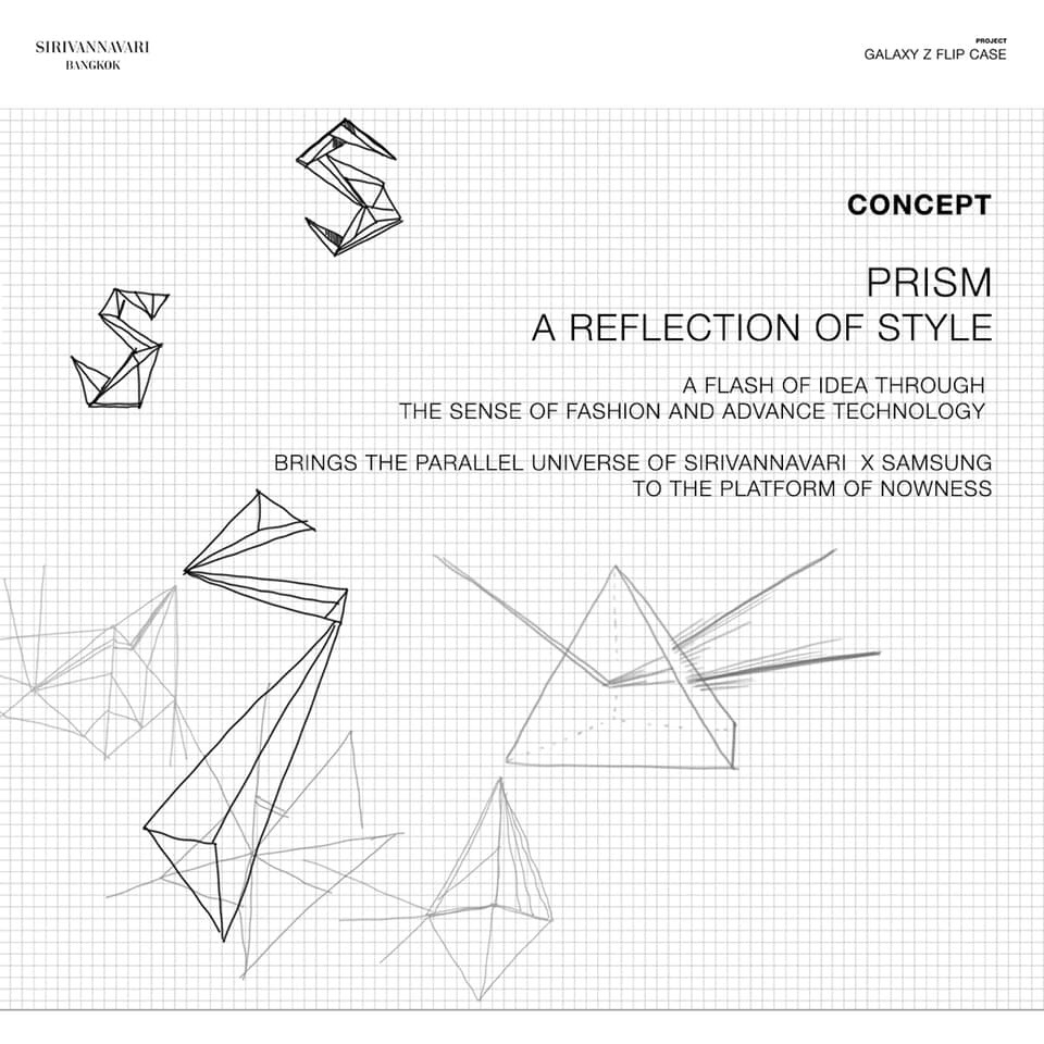 สมเด็จพระเจ้าลูกเธอ เจ้าฟ้าสิริวัณณวรี นารีรัตนราชกัญญา ทรงได้แรงบันดาลพระทัยจากลักษณะที่เหมือนกันของทั้งสอง แบรนด์ ตั้งแต่ ความโมเดิร์น ความล้ำยุคแบบฟิวเจอริสติก ไปจนถึงตัวอักษร “S” ที่เป็นอักษรนำของชื่อแบรนด์ทั้งสอง โดยองค์ดีไซน์เนอร์ได้ทรงเริ่มต้นงานทรงออกแบบด้วยการนำเอาลายเส้นของตัวอักษร S มาวางเป็นลวดลายกราฟฟิกแบบพลิกกลับไปมา (Flipped Graphic) ทำให้ลวดลายกราฟฟิกที่ได้มีลักษณะคล้ายรูปทรงตัว Z ซึ่งสัมพันธ์กับชื่อรุ่นของ Galaxy Z Flip หลังจากนั้น องค์ดีไซน์เนอร์จึงทรงนำเอาลายเส้นกราฟฟิกดังกล่าวมาทรงสร้างสรรค์ต่อจนออกมาเป็นลายเส้นปริซึม (PRISM) ที่ตัดกันไปมาโดยแฝงไว้ด้วยตัวอักษร Z อย่างแยบยล อันเป็นการผสมผสานเอกลักษณ์แห่งงานดีไซน์ของทั้งสองแบรนด์ไว้ได้อย่างลงตัว
