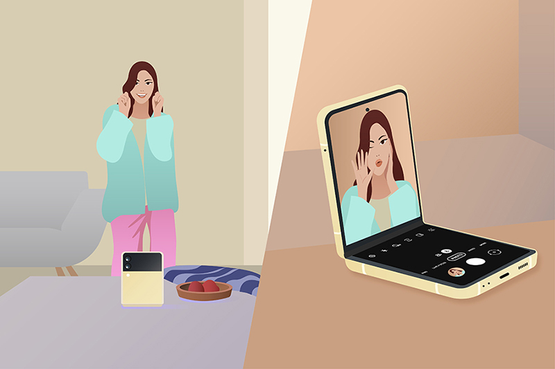 สายทำคอนเทนต์คงรู้กันดีว่ากว่าจะได้แต่ละรูปมาโพสต์ลงโซเชียลนั้นยากแค่ไหน กว่าจะหามุม กว่าจะจัดพรอพ พอได้ที่แล้วก็ต้องเช็คอุปกรณ์อีกว่าพร้อมไหม ไหนจะต้องหาคนกดชัตเตอร์ให้อีก และถ้าจะถ่ายรูปคนเดียวก็ต้องหาตัวช่วยอย่างขาตั้งหรือ Grip Tok ติดหลังสมาร์ทโฟนเพื่อตั้งหรือพิงให้ถ่ายรูปได้ แล้วก็ต้องมีรีโมทคอนโทรลไว้คอยกดชัตเตอร์ไปอีก แต่ด้วย Flex Mode ใน Galaxy Z Flip3 5G ที่ช่วยให้ผู้ใช้สามารถถ่ายรูปตัวเองได้แบบแฮนด์ฟรีเพียงแค่กางสมาร์ทโฟนออกให้ได้องศาที่ต้องการแล้วตั้งไว้ตรงหน้าก็สามารถทำคอนเทนต์ที่ไหนก็ได้แบบไม่ต้องง้อตัวช่วย แถมยังมีฟีเจอร์ Palm Selfie ที่แค่ยกฝ่ามือก็สามารถถ่ายเซลฟี่ด้วยกล้องด้านหน้าได้ทันที หรือถ้าถ่ายรูปแบบ Group Shot ก็ไม่ต้องกลัวว่าจะมีใครหลุดเฟรมเพราะมีฟีเจอร์ Auto Framing ที่ช่วยปรับรูปแบบการถ่ายภาพและวิดีโอโดยอัตโนมัติตามสถานที่และจำนวนคนหรือวัตถุในเฟรม สนุกไปกับการทำคอนเทนต์ได้อย่างง่ายดาย จะอัดคลิปเต้นลง TikTok 10 เทค หรือถ่ายรูปซัก 100 รูป ก็ไม่มีหวั่น