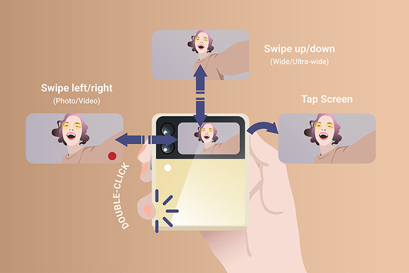 ถ้าคิดว่า Galaxy Z Flip3 5G ต้องเซลฟี่ด้วยกล้องด้านในแบบสมาร์ทโฟน Bar-Type เท่านั้น ขอบอกเลยว่าคิดผิด เพราะเพียงแค่ดับเบิ้ลคลิกที่ปุ่มข้างตัวเครื่องเมื่อพับหน้าจอก็สามารถเรียกโหมดกล้องขึ้นมาถ่ายรูปด้วยกล้องหลังแบบคมชัดได้ทันที พร้อมยังมีคีย์ลัดมากมายเพื่อเลือกรูปแบบการถ่ายภาพได้ตามความต้องการแบบไม่ต้องกางเครื่อง เช่น