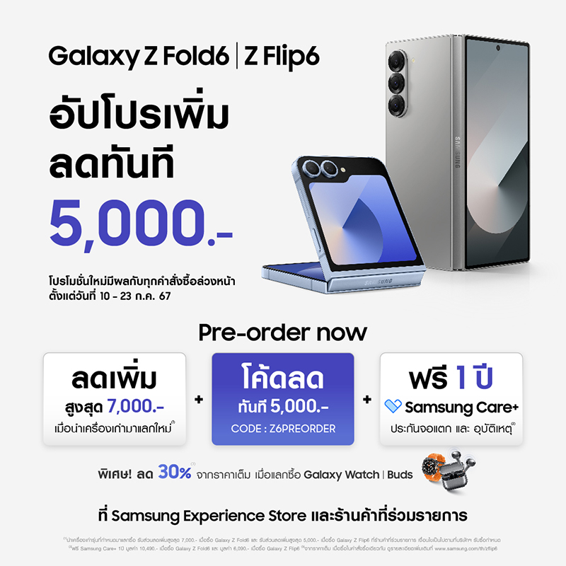 ชาวพับห้ามพลาด! ซัมซุง มอบส่วนลดเพิ่ม 5,000 บาท สำหรับลงทะเบียนสั่งจองล่วงหน้า Galaxy Z Fold6 l Z Flip6 เป็นเจ้าของสมาร์ทโฟนจอพับก่อนใคร พร้อมรับสิทธิพิเศษอีกเพียบ!