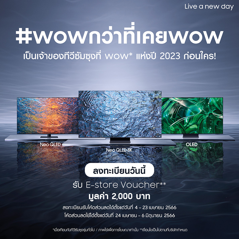 ซัมซุง ผู้นำแบรนด์ยอดขายทีวีอันดับหนึ่งทั่วโลก รุกหนักทำตลาดทีวีพรีเมียมต้นปี สร้างมาตรฐานประสบการณ์เทคโนโลยีเหนือระดับกว่าทีวีซัมซุงทุกรุ่นที่เคยมีมา เปิดให้ลูกค้าลงทะเบียนแสดงความสนใจ สำหรับ ทีวีรุ่นใหม่ปี 2023 ที่ยกขบวนทีวีพรีเมียมมาครบทุกไลน์อัพ ทั้ง Neo QLED 8K, Neo QLED 4K และ OLED TV ทีวีพรีเมียมที่ว้าวยิ่งกว่า คมชัดที่กว่าที่เคยเป็นมา พร้อมชิพประมวลผล Neural Quantum Processor ระดับ 8K ขนาดหลากหลาย ครอบคลุมทุกรูปแบบการใช้งาน ตั้งแต่ 43 นิ้ว ไปจนถึง 85 นิ้ว มากับดีไซน์บางเฉียบไร้ขอบสุดว้าวในตลาด ดื่มด่ำเสียงอันทรงพลังด้วย Dolby Atmos® สามารถลงทะเบียนได้ที่ www.samsung.com/th/tvs/hand-raiser ตั้งแต่วันนี้ – 23 เมษายนนี้ พร้อมรับบัตรกำนัลส่วนลดมูลค่า 2,000 บาท สำหรับการสั่งซื้อ Samsung Neo QLED TV 8K, Neo QLED 4K และ OLED TV บนเว็บไซต์ Samsung.com บัตรกำนัลส่วนลดสามารถใช้ได้ตั้งแต่วันที่ 24 เมษายน – 6 มิถุนายน 2566