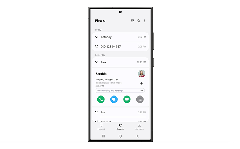 ด้านการโทร One UI 7 ได้เพิ่มฟีเจอร์ใหม่อย่าง Call Transcript ช่วยเพิ่มขีดความสามารถในการสื่อสารผ่านการถอดเสียงสนทนา รองรับมากถึง 20 ภาษา เพียงเปิดใช้งานการบันทึกเสียงระหว่างการโทร ซึ่งผู้ใช้สามารถกดย้อนฟังในภายหลังได้ ลดความยุ่งยากในการจดบันทึกระหว่างพูดคุย ช่วยให้มีเวลาโฟกัสกับการทำงานอื่นมากขึ้น ทั้งนี้ ผู้ใช้งานสามารถเปิด-ปิดฟีเจอร์นี้ได้ใน การตั้งค่า > แอปพลิเคชันโทรศัพท์