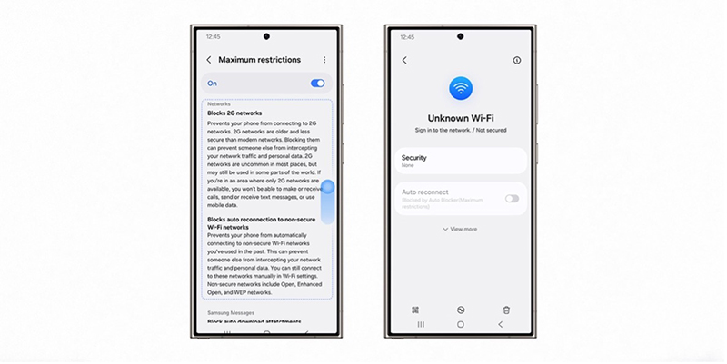 การตั้งค่าความปลอดภัยสูงสุดสร้างแนวทางป้องกันที่แข็งแกร่งต่อภัยคุกคามทางไซเบอร์ในปัจจุบัน One UI 7 เพิ่มทางเลือกให้กับผู้ใช้ด้วยฟีเจอร์ใหม่ที่ออกแบบมาเพื่อปกป้องผู้ที่ต้องการความปลอดภัยขั้นสูง โดยการตั้งค่าความปลอดภัยสูงสุดจะได้รับการอัปเดตด้วยการควบคุมการเชื่อมต่อเครือข่ายเพิ่มเติม เพื่อให้ผู้ใช้สามารถใช้งานได้อย่างสบายใจที่ได้รับการป้องกันข้อมูลส่วนตัวอย่างรัดกุม โดยไม่สูญเสียการเข้าถึงฟังก์ชันหลักของอุปกรณ์ ผู้ใช้สามารถเลือกที่จะบล็อกบริการ 2G และป้องกันไม่ให้ข้อมูลถูกดักจับเมื่อเชื่อมต่อกับเครือข่ายที่ไม่ปลอดภัย นอกจากนี้ ผู้ใช้ยังสามารถป้องกันไม่ให้มีการเชื่อมต่อ Wi-Fi อัตโนมัติไปยังเครือข่ายบางแห่งที่อาจไม่ปลอดภัย เพื่อให้ข้อมูลยังคงเป็นส่วนตัวในขณะที่ยังมีตัวเลือกในการเชื่อมต่อด้วยตนเองหากต้องการ