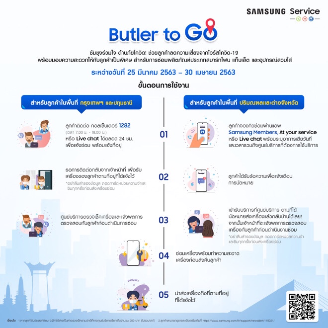 – สำหรับลูกค้าที่ในพื้นที่ปริมณฑลและต่างจังหวัด สามารถจองคิวซ่อมผ่านช่องทางแอปพลิเคชัน Samsung Members หรือช่องทางเว็บไซต์ At your service และช่องทาง Live chat โดยแจ้ง อาการเสีย วันเวลาและเลือกศูนย์บริการจากทั้งหมด 28 สาขา เมื่อลูกค้าได้รับข้อความยืนยัน การนัดหมายแล้ว สามารถเข้าไปใช้บริการซ่อมได้ตามที่ได้นัดหมาย เมื่อส่งอุปกรณ์แล้ว สามารถกลับบ้านเพื่อรอรับอุปกรณ์คืนหลังการซ่อมตามที่อยู่ที่แจ้งไว้ฟรี