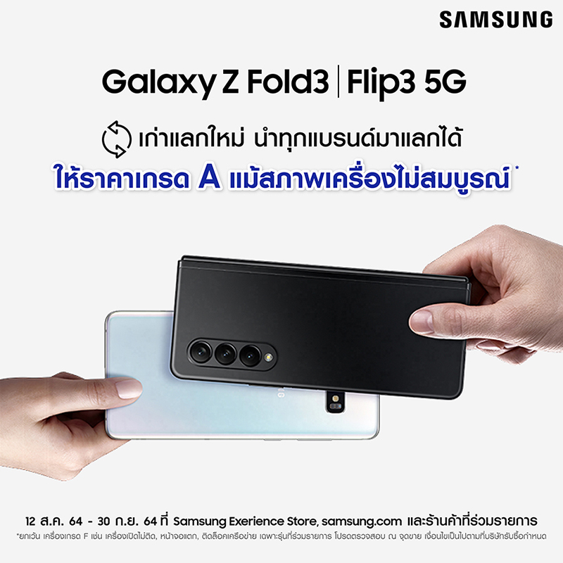 เก็บสมาร์ทโฟนเครื่องเก่าไว้ทำไม! ซัมซุงชวนนำเครื่องเก่าสูงสุด 3 เครื่องมาแลกเป็นส่วนลดในราคาเกรด A เพื่อซื้อสมาร์ทโฟนหน้าจอพับได้รุ่นใหม่ Galaxy Z Fold3 | Flip3 5G พร้อมคุ้มยิ่งกว่าคุ้ม! เมื่อจับคู่กับแคมเปญ First to Unfold เพิ่มสิทธิ์ในการรับเครื่องเป็นกลุ่มแรกของไทย พร้อมคูปองเงินสดมูลค่าสูงสุด 9,000 บาท และ Samsung Care+ 1 ปี มูลค่า 7,089 บาท