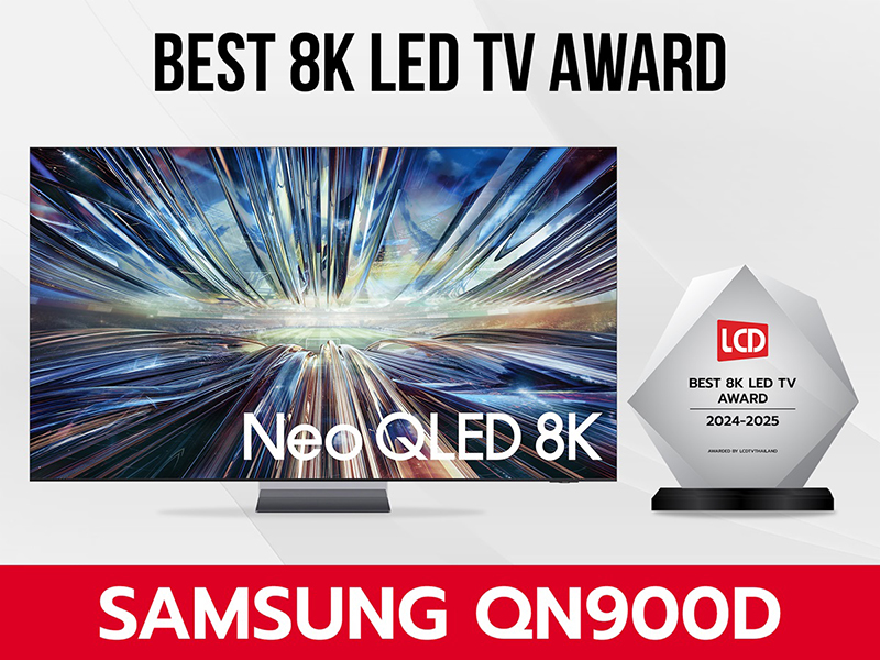 Best 8K LED TV Award : Samsung QN900D มาพร้อมกับเทคโนโลยี Neo QLED 8K และ Mini LED ยกระดับความคมชัดของแสงและเงาได้อย่างแม่นยำ ตัวทีวีมาพร้อมดีไซน์ไร้ขอบ Infinity Screen สร้างมุมมองการรับชมที่เต็มตา และมี AI Upscaling ที่ช่วยปรับคุณภาพของภาพให้ใกล้เคียงระดับ 8K มากที่สุด