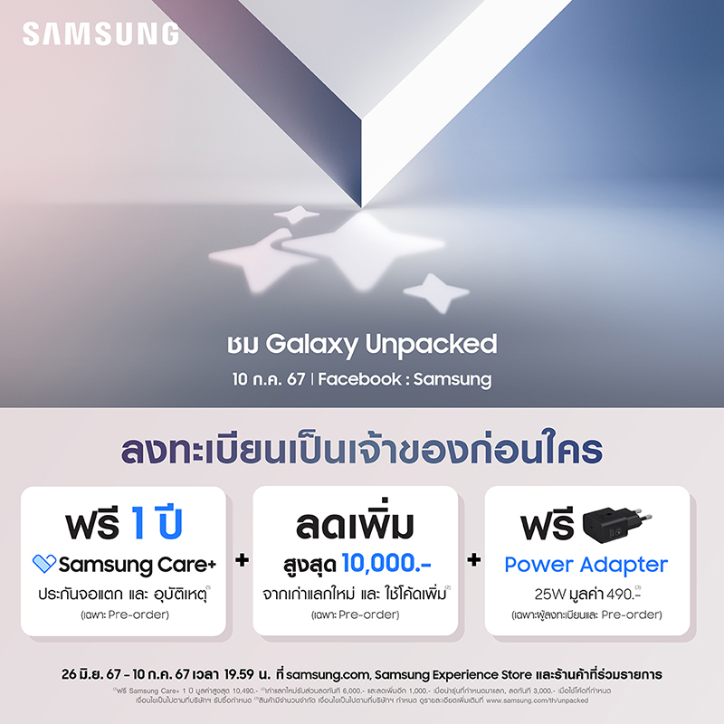 พิเศษ! ลุ้นรับเพิ่มเป็นเจ้าของ The new Galaxy Cry Box มูลค่ารวมสูงสุด 65,120 บาท เพียงกรอกข้อมูลลงทะเบียนให้ครบถ้วน ลงทะเบียนได้แล้วที่ smsng.store/Samsung-Galaxy-Handraiser ตั้งแต่วันที่ 26 มิถุนายน – 10 กรกฎาคม 2567 เวลา 19.59 น. เท่านั้น!