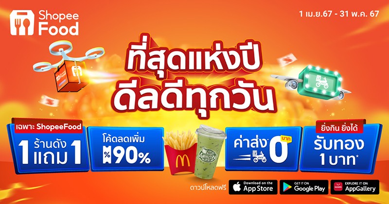 พร้อมกันนี้ ShopeeFood ยังเสิร์ฟความอิ่มคุ้มสุดฟินใน “ShopeeFood ที่สุดแห่งปี ดีลดีทุกวัน” ให้นักชิมชาวไทย ได้เพลิดเพลินไปกับโค้ดส่วนลดถึง 90%* จากทัพร้านอาหารแบรนด์ดังยอดนิยม อาทิ KFC, Pizza Hut, กาแฟพันธุ์ไทย, McDonald’s, Chester’s, Swensen’s, Dairy Queen, Major Cineplex, Shinkanzen Sushi และอีกมากมาย พร้อมกิจกรรมสุดพิเศษที่ทั้งคุ้มและฟิน ด้วยไฮไลต์ต่าง ๆ ได้แก่ โค้ดลดสูงสุด 90% ไม่มีขั้นต่ำ* !พร้อมค่าส่ง 0 บาท*, โปรโมชันร้านดัง 1 แถม 1* ทุกวันตลอดทั้งแคมเปญ และยังมีกิจกรรม“ยิ่งกิน ยิ่งได้” รับทอง 1 บาท* ให้สะสมคะแนนเพื่อแลกรางวัลมากมาย รวมถึงทองคำหนัก 1 บาท ตั้งแต่วันนี้-31 พฤษภาคม 2567