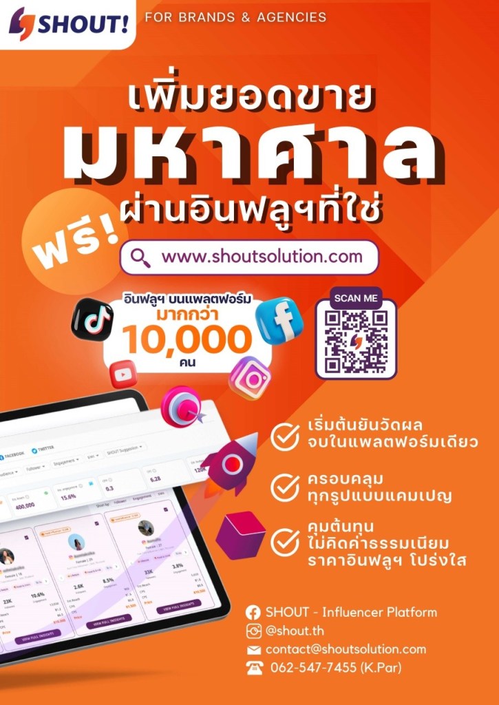 บริษัท เชาท์ ทูเกทเตอร์ จำกัด (Shout Together Company Limited) หรือ “SHOUT!” แพลตฟอร์ม การตลาดและสร้างยอดขายผ่านอินฟลูเอนเซอร์ครบวงจรและมีประสิทธิภาพสูงสุด เปิดตัวฟีเจอร์ใหม่ “Influencer Platform Designed for Brands & Agencies” ช่วยแบรนด์และเอเจนซี่ วางแผนแคมเปญ เลือกอินฟลูฯ ที่ตรงกลุ่ม เป้าหมาย คุมงบฯ ได้