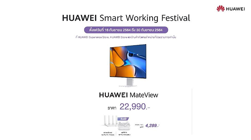 หัวเว่ยสนับสนุนให้คนทำงานอย่างสมาร์ทด้วยดีไวซ์อัจฉริยะ สร้างสมดุลระหว่างการทำงานและการใช้ชีวิตได้อย่างลงตัวกับโอกาสสุดท้ายของโปรโมชันพิเศษในช่วงเทศกาล HUAWEI Smart Working Festival เมื่อซื้อ HUAWEI MateView ราคา 22,990 บาท รับไปเลยของสมนาคุณเป็นอุปกรณ์เชื่อมต่อ HUAWEI WiFi WS52000 และ หูฟังไร้สาย HUAWEI FreeBuds 3i มูลค่ารวม 4,289 บาท ระหว่างวันที่ 16 กันยายน 2564 – 30 กันยายน 2564 นี้เท่านั้น ที่ HUAWEI Experience Store, HUAWEI Store และร้านค้าที่ร่วมรายการเท่านั้น นอกจากนี้ยังมีสินค้าไอทีอื่นๆ ที่จะมาปฎิวัติการทำงานของคุณให้สมาร์ทยิ่งกว่าใคร โดยสามารถดูรายละเอียดเพิ่มเติมได้ ที่นี่ และผ่านช่องทางออนไลน์แพลตฟอร์มต่างๆ ทั้ง เฟซบุ๊กเพจ Huawei Mobile TH | Line | Shopee | Lazada