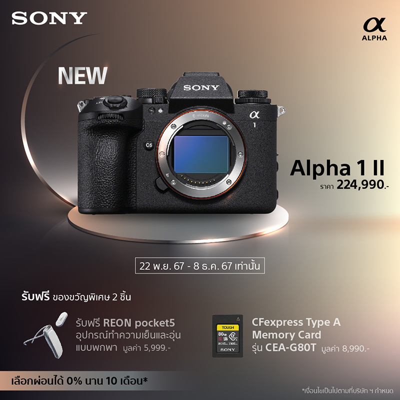 กล้อง Alpha 1 II พร้อมเปิดให้ผู้สนใจสั่งจองล่วงหน้าได้ตั้งแต่วันที่ 22 พฤศจิกายน – 8 ธันวาคม 2567 ในราคา 224,990 บาท พร้อมของแถมพิเศษฟรีทันที เป็นอุปกรณ์ทำความเย็นและอุ่นแบบพกพาจาก Sony รุ่น REON POCKET 5 มูลค่า 5,999 บาท และการ์ด CFexpress รุ่น CEA-G80T มูลค่า 8,999 บาท ลูกค้าที่สั่งจองล่วงหน้าเริ่มรับสินค้าตั้งแต่วันที่ 14 ธันวาคม 2567 เป็นต้นไป