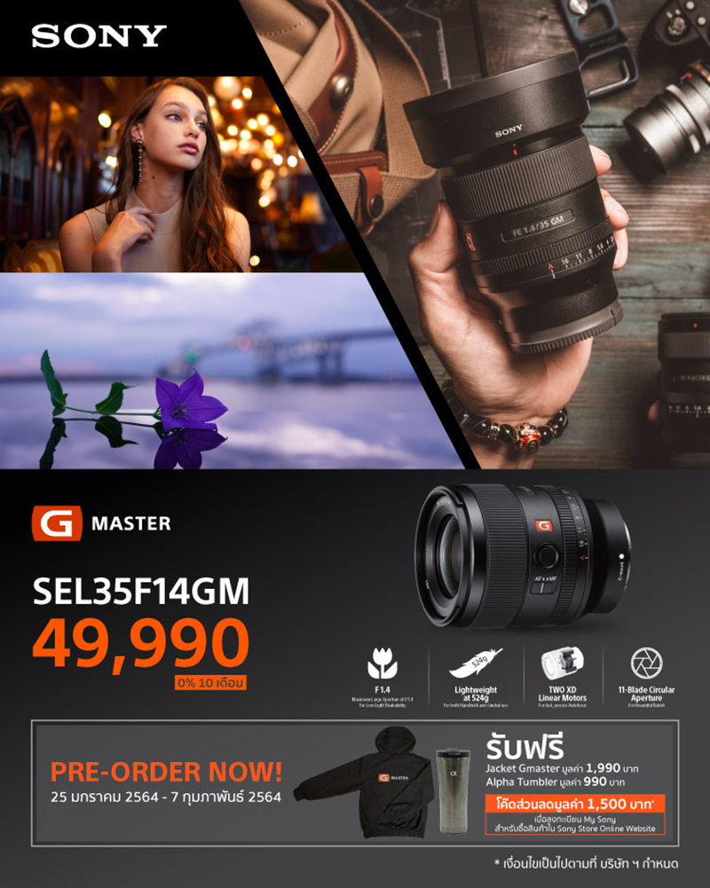 เลนส์ FE 35mm F1.4 GM (รุ่น SEL35F14GM) พร้อมเปิดให้ผู้สนใจสั่งจองในระหว่างวันที่ 25 มกราคม – 7 กุมภาพันธ์ 2564 ในราคา 49,990 บาท พร้อมรับของสมนาคุณ และสิทธิพิเศษ ดังนี้