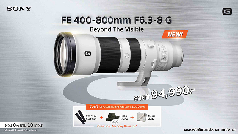 เลนส์ FE 400-800mm F6.3-8 G OSS จะเริ่มวางจำหน่ายตั้งแต่วันที่ 8 มีนาคม 2568 ในราคา 94,990 บาท โดยลูกค้าจะได้รับสิทธิ์ของแถมพิเศษ ได้แก่ ปลอกแขน Cool Tech, หมวกบักเก็ต และ Magic Cloth รวมมูลค่า 1,770 บาท เพียงลงทะเบียน My Sony Rewards และตอบแบบสอบถามจาก Leaflet ข้างกล่องให้ครบถ้วน ภายในวันที่ 8 มีนาคม 2568 – 13 เมษายน 2568 ทั้งนี้ ของแถมจะเริ่มจัดส่งให้ลูกค้าช่วงปลายเดือนเมษายน 2568 เป็นต้นไป