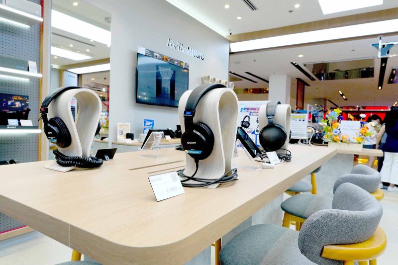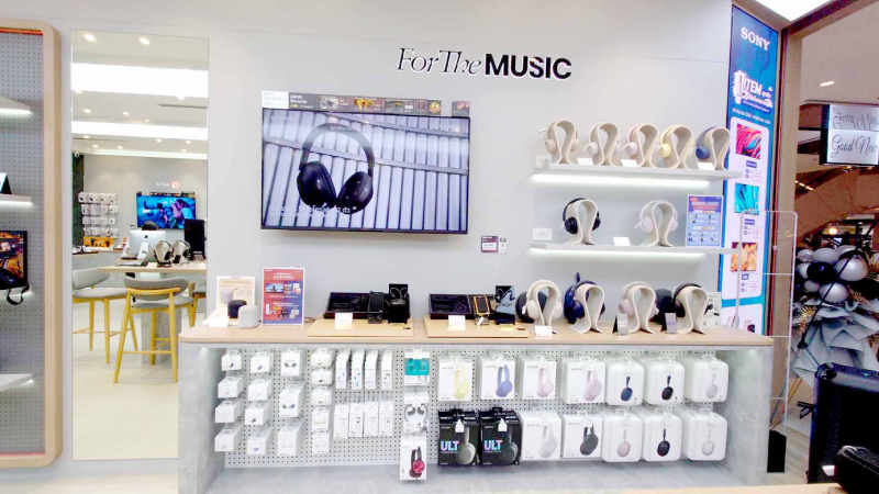 ภายในร้านยังมีโซนหูฟังและลำโพงที่ครบครัน ตั้งแต่รุ่นพกพาไปจนถึงรุ่นขนาดใหญ่ รองรับการฟังเพลงในชีวิตประจำวัน ไปจนถึงการสร้างบรรยากาศในงานปาร์ตี้ที่บ้าน ภายใต้แนวคิด “For The Music” ที่สะท้อนถึงความเข้าใจในไลฟ์สไตล์ของผู้ใช้งานยุคใหม่ ซึ่งไม่ได้มองหูฟังเพียงเพื่อฟังเพลงเท่านั้น แต่ยังมองว่าเป็นแฟชั่นไอเทมที่ช่วยเสริมบุคลิก โซนี่จึงออกแบบพื้นที่ให้ลูกค้าสามารถทดลองสวมใส่หูฟัง หรือสะพายลำโพงหน้ากระจก เพื่อให้มั่นใจว่าแบบและสีที่เลือกนั้นสอดคล้องกับสไตล์ของตนเอง นอกจากนี้ยังมีการจัดแสดงหูฟังทุกรุ่น ทุกสี ไม่ว่าจะเป็นโทนมินิมอลยอดนิยม สีพาสเทลใหม่ล่าสุด หรือดีไซน์แบบใส เพื่อให้ผู้ที่ต้องการเห็นหูฟังของจริงในทุกเฉดสีสามารถเลือกชมได้อย่างครบถ้วน โซนี่ สโตร์ เซ็นทรัลเวิลด์จึงสามารถตอบโจทย์ความต้องการได้อย่างรอบด้าน และทั้งหมดนี้สะท้อนถึงความตั้งใจของโซนี่ในการเชื่อมโยงเทคโนโลยีเข้ากับความต้องการของผู้ใช้งานในทุกมิติอย่างแท้จริง