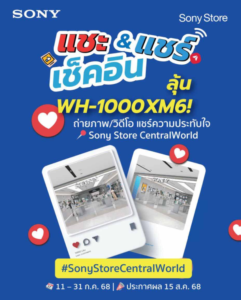 เพียงถ่ายภาพหรือวิดีโอที่ร้านโซนี่ สโตร์ เซ็นทรัลเวิลด์ แล้วโพสต์ลง Facebook หรือ TikTok ตั้งค่าเป็นสาธารณะ พร้อมติดแฮชแท็ก #SonyStoreCentralWorld ตั้งแต่วันที่ 11 กรกฎาคม 2568 – 31 กรกฎาคม 2568 (ประกาศผล 15 สิงหาคม 2568)