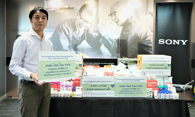 บริษัท โซนี่ ไทย จำกัด นำโดย มร. มาซากิ มัทซูมาเอะ กรรมการผู้จัดการ พร้อมด้วยพนักงาน และครอบครัว ได้ร่วมใจในกิจกรรมเพื่อสังคม “ยาเก่า เราขอ…ร่วมสานต่อลมหายใจ” ร่วมบริจาคยา และเวชภัณฑ์ทั้งที่เหลือใช้ และยังไม่หมดอายุ รวมถึงจัดซื้อยาเวชภัณฑ์ใหม่ที่จำเป็นต่าง ๆ เพื่อส่งมอบแก่โรงพยาบาลอุ้มผาง จังหวัดตาก เพื่อนำไปใช้ประโยชน์ และจัดสรรให้แก่หน่วยงานสาธารณสุขที่ขาดแคลน และผู้ด้อยโอกาสในพื้นที่ชายแดนต่อไป นอกจากนี้ โซนี่ไทยยังได้ร่วมบริจาคเงินสมทบจำนวน 20,000 บาท ให้แก่ทางโรงพยาบาล ฯ เพื่อใช้ในการจัดซื้อเวชภัณฑ์ และอุปกรณ์ทางการแพทย์ที่จำเป็นต่อไป