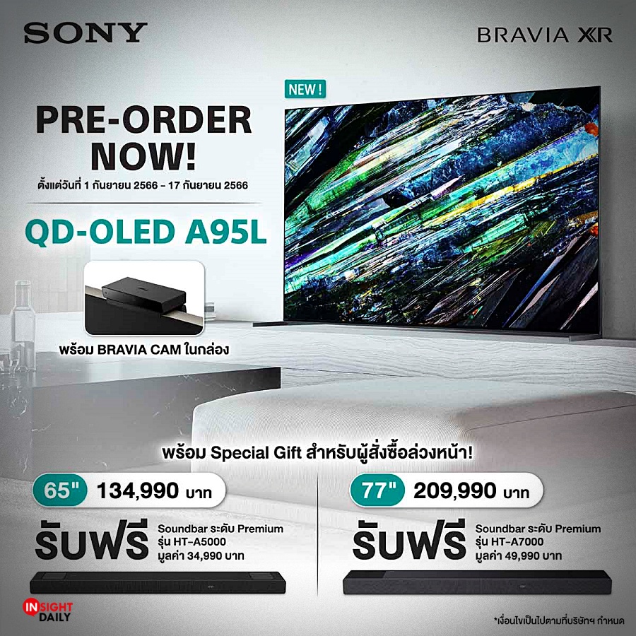 - BRAVIA XR 4K HDR QD-OLED Google TV ซีรี่ส์ A95L ในรุ่น XR65A95L ขนาด 65 นิ้ว ราคา 134,990 บาท พร้อมรับของสมนาคุณสุดพิเศษ ซาวด์บาร์รุ่น HT-A5000 มูลค่า 34,990 บาท