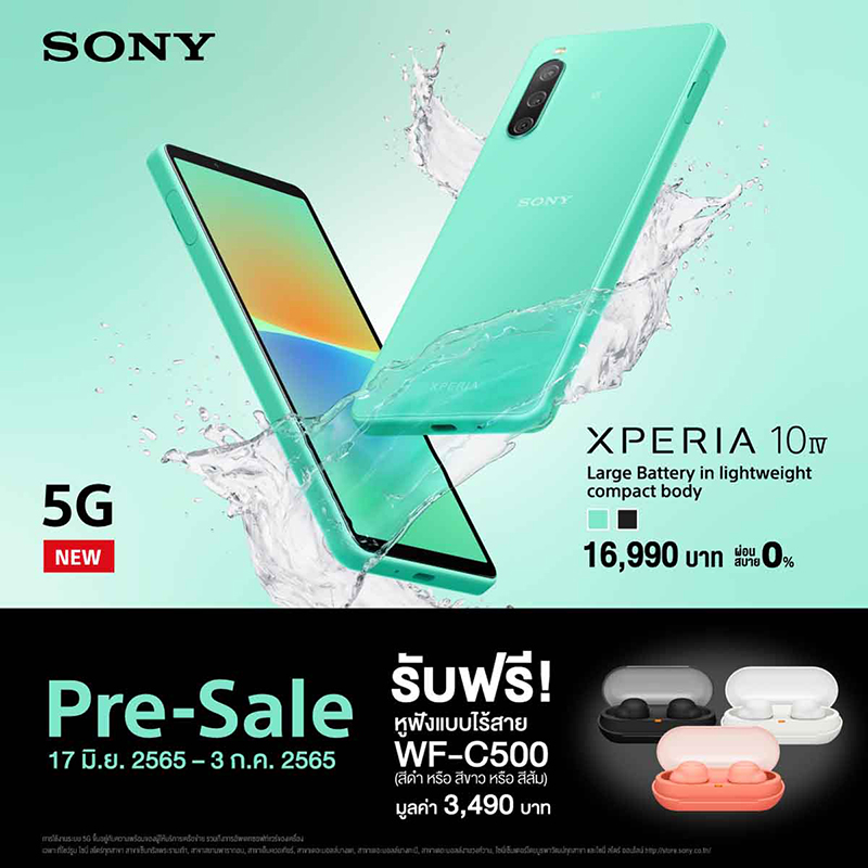 บริษัท โซนี่ ไทย จำกัด ขอแนะนำสมาร์ทโฟนระดับกลางรุ่นใหม่ล่าสุดกับ Xperia 10 IV (อ่านว่า เอ็กซ์พีเรีย เท็น มาร์ค โฟร์) สมาร์ทโฟนที่เบาสุดในโลกมาพร้อมแบตเตอรี่ขนาดใหญ่ถึง 5,000 mAh ผสานเทคโนโลยีอันเป็นเอกลักษณ์ของโซนี่เข้าไว้ด้วยกันได้อย่างลงตัว ด้วยการออกแบบที่เล็กกะทัดรัด และสะดวกต่อการพกพา ทำให้ Xperia 10 IV เป็นสมาร์ทโฟนระดับกลางที่อัดแน่นด้วยเทคโนโลยีเพื่อความบันเทิง และการถ่ายภาพได้อย่างสมบูรณ์แบบ Xperia 10 IV มี 2 สีให้เลือกคือสีดำ และสีเขียวมิ้นท์ พร้อมเปิดให้ผู้สนใจได้สั่งจองล่วงหน้าตั้งแต่วันที่ 17 มิถุนายน ถึง 3 กรกฎาคม ศกนี้ ในราคา 16,990 บาท