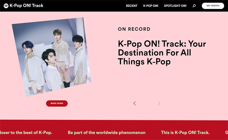 Spotify ได้เปิดตัวเว็บไซต์ที่ทุ่มเทให้กับทุกสิ่ง K-Pop โดยเฉพาะ ให้แฟนๆ ได้ใกล้ชิดกับศิลปินและเพลงที่พวกเขารัก K-Pop ON! Track จะช่วยให้ทุกคน ตั้งแต่แฟนเพลง K-Pop ที่กำลังค้นพบแนวเพลงอยู่ไปจนถึงสแตน K-pop ได้มีฐานเพื่อติดตามข่าว K-Pop ทั้งหมดของ Spotify รวมถึงการสัมภาษณ์พิเศษศิลปิน อัปเดตข่าวในวงการ และเทรนด์ต่าง ๆ ที่กำลังจะเกิดขึ้นและอื่น ๆ อีกมากมาย