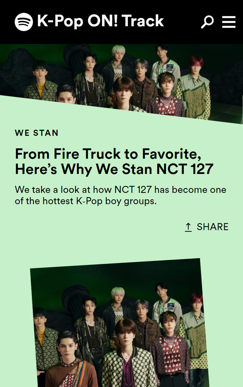 จัดทำขึ้นเพื่อเสริมประสบการณ์การสตรีม K-Pop ON! Track ซึ่งเติมเต็มไปด้วยเนื้อหาที่จะนำแฟนๆ เข้าสู่จักรวาล K-Pop ได้อย่างลึกซึ้ง รวมถึงบทความที่ช่วยอธิบายความหมายของคำศัพท์ในวงการ K-Pop คำแนะนำทีละขั้นสำหรับวิธีสร้างเพลย์ลิสต์ Spotify Blend กับ BTS ซีรีส์ที่อุทิศให้กับผู้ที่ ‘We Stan’ (เริ่มต้นด้วย NCT127) ไปจนถึงการพูดคุยกับผู้เชี่ยวชาญด้าน K-Pop อีกทั้งไซต์นี้จะยกย่องผู้คนมากความสามารถที่อยู่เบื้องหลังแทร็กดัง รวมไปจนถึงการฉลองแฟนๆ ในระดับแนวหน้าของ K-Pop