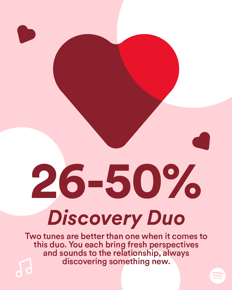 - 71-90% – เกิดมาเพื่อกันและกัน (Made for Us): ราวกับชะตาฟ้าลิขิต ความสัมพันธ์ของคุณถูกกำหนดไว้ด้วยโชคชะตา คุณทั้งคู่มีเพลงที่ใช่ และศิลปินที่ชอบอยู่ในใจ แต่เชื่อหรือไม่ว่าเพลงที่ฟังซ้ำแล้วซ้ำอีกดันเป็นเพลงเดียวกัน