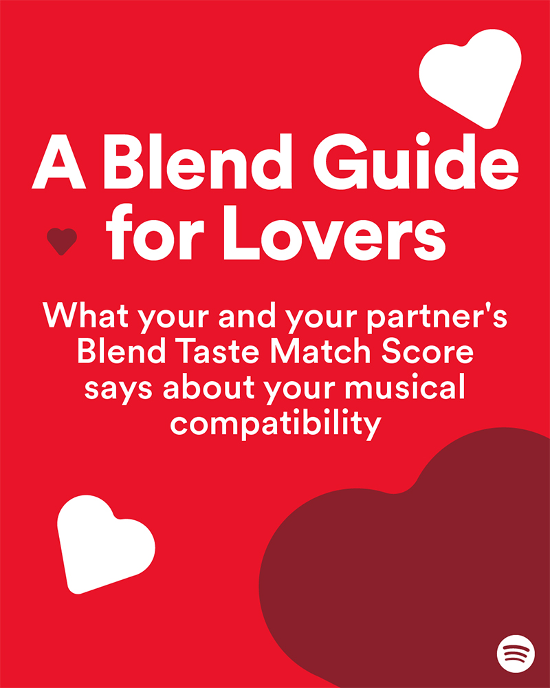 คุณสมบัติที่โดดเด่นของ Blend คือการแสดงคะแนน ‘Taste Match’ ที่เปรียบเทียบรสนิยมการฟังเพลงของผู้ใช้งานออกมาเป็นคะแนนความเข้ากันได้ทางสไตล์เพลง (หากได้คะแนน 0% จะเป็นการยืนยันว่า “ยิ่งต่างกัน ก็ยิ่งดึงดูด” และหกได้ 100% ก็หมายถึง “เข้ากันได้อย่างสมบูรณ์แบบสุดๆ”) โดยในวันวาเลนไทน์นี้ Spotify จะมาเผยให้รู้ลึก รู้ละเอียด กันไปเลยว่าคะแนนเหล่านี้สะท้อนความสัมพันธ์ของคุณและคนรัก ผ่านรสนิยมทางดนตรีได้อย่างไรบ้าง