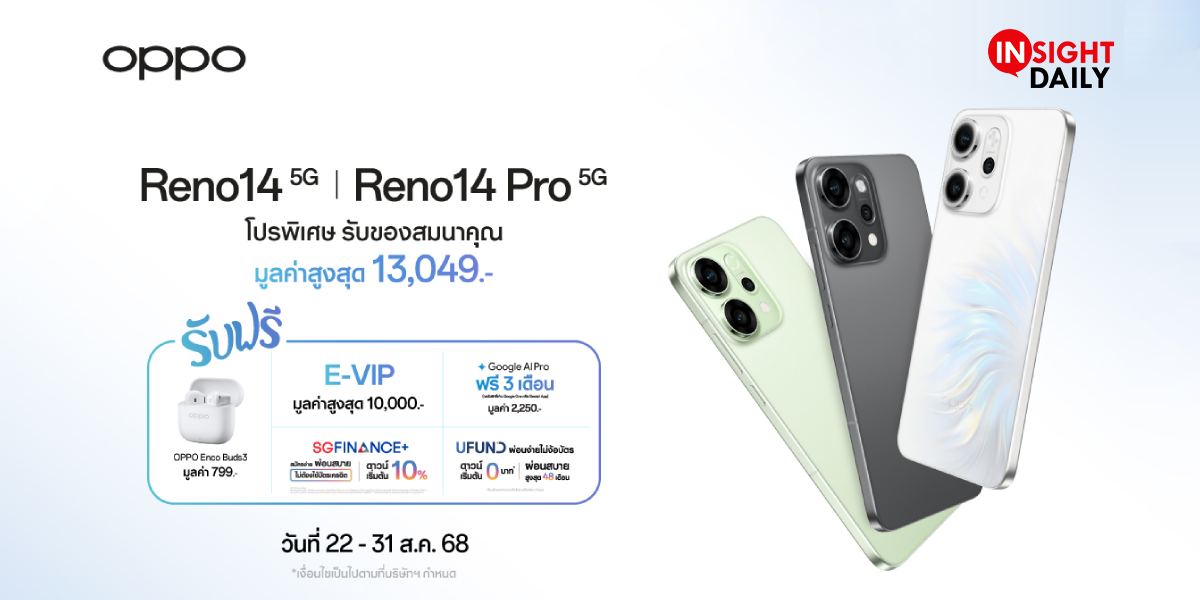 โปรโมชันพิเศษ! เมื่อซื้อ OPPO Reno14 5G และ OPPO Reno14 Pro 5G รับฟรี OPPO Enco Buds3 มูลค่า 799 บาท!