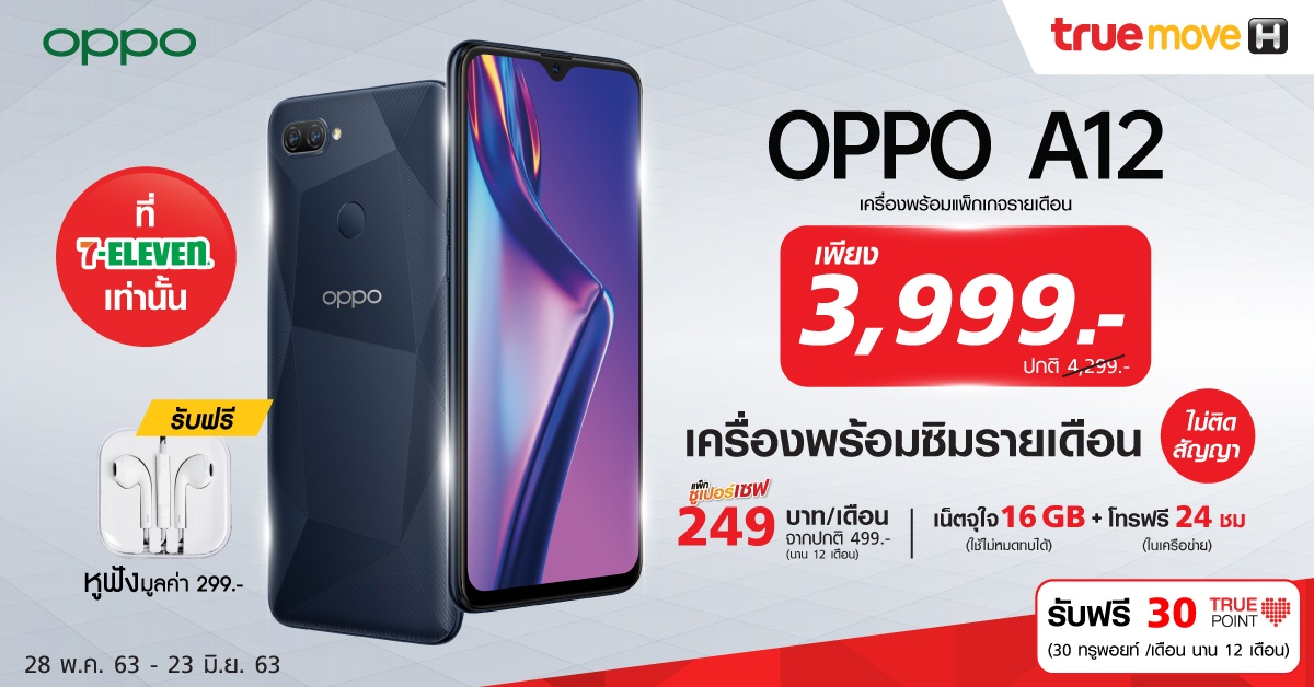 Read MoreOPPO และ Truemove H จัดโปรโมชั่นสุด Exclusive เมื่อซื้อสมาร์ทโฟน OPPO A12 ในราคาพิเศษ เพียง 3,999 บาท จากปกติ 4,299 บาท