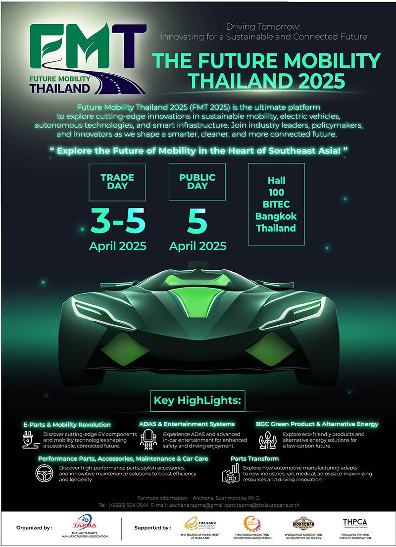 Future Mobility Thailand 2025 – เวทีเชื่อมโยงอุตสาหกรรมไทยสู่อนาคต จัดโดยสมาคมผู้ผลิตชิ้นส่วนยานยนต์ไทย และได้รับการสนับสนุนจากสำนักงานคณะกรรมการส่งเสริมการลงทุน สมาคมส่งเสริมการรับช่วงการผลิตไทย สมาคมผู้ค้าอะไหล่วรจักร และสมาคมแผ่นวงจรพิมพ์ไทย ซึ่งคาดว่าจะ ได้ รับความสนใจจาก ค่ายรถยนต์ระดับโลก ผู้นำเข้า-ส่งออก ผู้พัฒนาเทคโนโลยียานยนต์ไฟฟ้า ผู้ผลิตชิ้นส่วน และนักลงทุนที่ต้องการมีส่วนร่วมในการขับเคลื่อนอุตสาหกรรมยานยนต์ของไทย