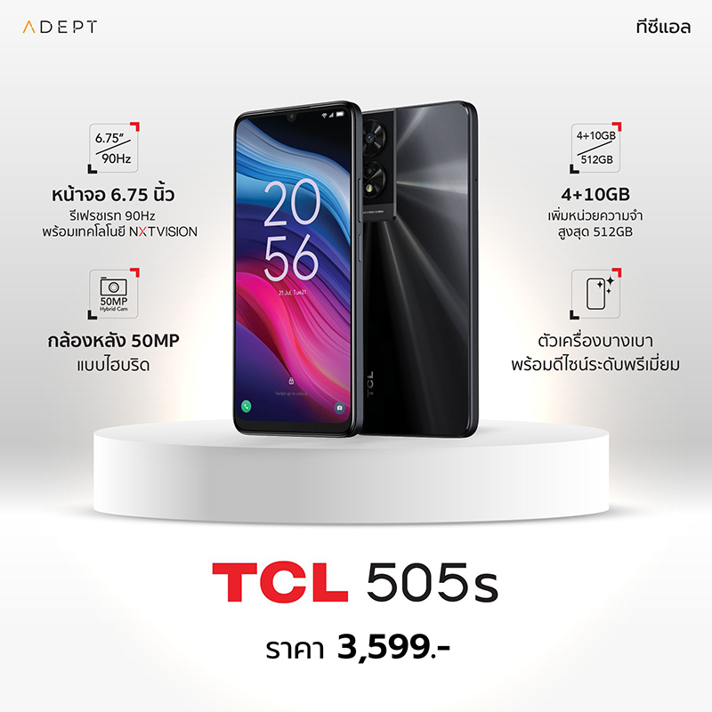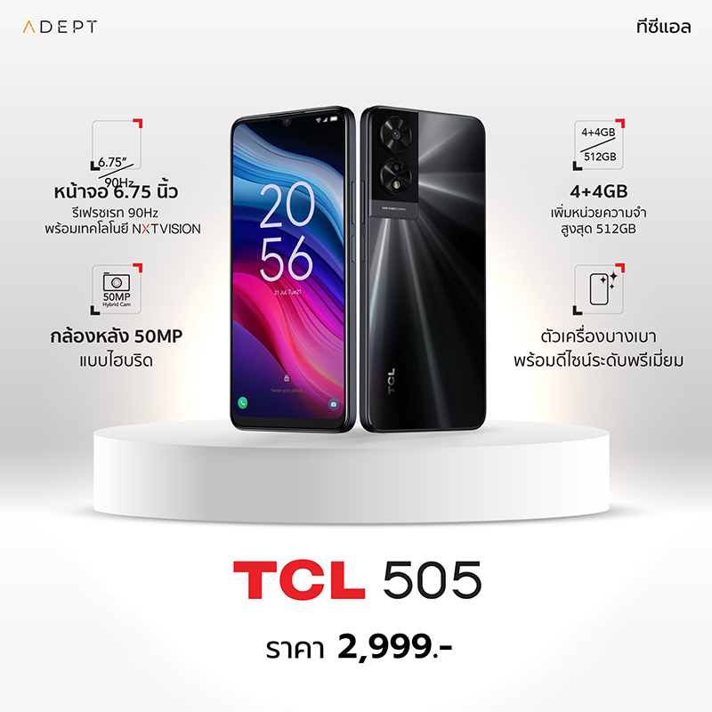 บริษัท เอเดพท์ จำกัด ผู้นำเข้าและจัดจำหน่ายสมาร์ทโฟนและอุปกรณ์สมาร์ทดีไวซ์ในประเทศไทย เปิดตัวสมาร์ทโฟนจาก TCL Mobile รุ่นใหม่ล่าสุด TCL 503, TCL 505 และ TCL 505s ที่มาพร้อมกับประสิทธิภาพที่เกินราคา ดีไซน์พรีเมียม ชูเทคโนโลยี TCL NXTVISION ที่พัฒนาอย่างต่อเนื่องเพื่อความสบายตาของผู้ใช้งาน พร้อมตอบโจทย์ทุกการใช้งานด้วยฟีเจอร์และสเปกที่ครบครันในแต่ละรุ่น