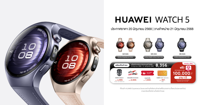 HUAWEI WATCH 5 เตรียมประกาศราคาไทยในวันที่ 20 มิถุนายน 2568 มอบประสบการณ์สมาร์ทวอชระดับเรือธงกับราคาที่คุ้มค่ากว่าระดับโลก พร้อมข้อเสนอรับของสมนาคุณรวมมูลค่าสูงสุด 8,356 บาท ตั้งแต่วันที่ 20 มิถุนายน – 31 กรกฏาคม 2568 ประกอบด้วย HUAWEI FreeBuds 5 ราคา 4,999 บาท (จำกัดเพียง 10,000 คำสั่งซื้อแรกเท่านั้น) สิทธิ์เก่าแลกใหม่และรับส่วนลดเพิ่มจากราคาประเมินมูลค่า 2,000 บาท My HUAWEI Voucher ส่วนลดค่าเครื่อง มูลค่า 1,000 บาท และ HUAWEI Health+ Membership มูลค่า 357 บาท (3 เดือน) และสิทธิ์ที่แอป Alive ฟรี ประกันกลุ่มจาก AIA มูลค่า 100,000 บาท นาน 1 ปี สิทธิ์มีจำนวนจำกัด ลงทะเบียนรับสิทธิ์ตั้งแต่ 20 มิถุนายน – 31 กรกฎาคม 2568