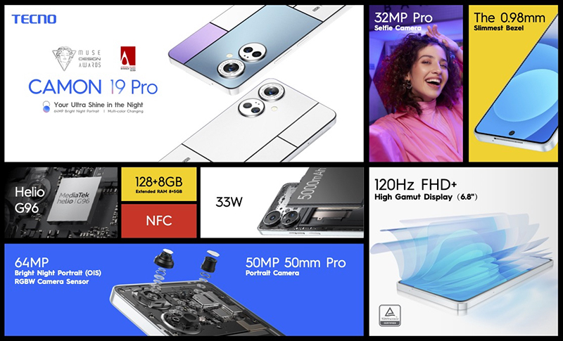 นางสาวกีกี้ หวัง ผู้จัดการประจำประเทศไทย เทคโน ประเทศไทย กล่าวเสริมว่า สมาร์ทโฟน TECNO CAMON 19 PRO ใหม่ ทั้งรุ่น 5G และ 4G โดดเด่นด้วยการออกแบบให้ขอบจอบางที่สุดในอุตสาหกรรมเพียง 0.98 มม. จอแสดงผล 120Hz FHD+ ขนาด 6.8 นิ้ว สามารถแสดงเฉดสีได้หลายเฉด (High Gamut Display) อัตราการรีเฟรชหน้าจอที่ 120 เฮิรตซ์ มอบประสบการณ์การรับชมที่คมชัด สว่าง แม่นยำ สมจริง ไม่ว่าจะเป็นการเล่นเกม ดูวิดีโอ หรือเลื่อนดูฟีดโซเชียลมีเดีย และเป็นจอที่ได้รับการรับรองจาก TüV Rheinland ว่าช่วยป้องกันตาแห้งขณะใช้จอ กล้องหลัง 3 ตัว พร้อมสุดยอดเซ็นเซอร์ RGBW เทคโนโลยีใหม่ที่ TECNO ร่วมพัฒนากับ Samsung และเลนส์แก้ว จึงทำให้รับแสงได้มากขึ้นกว่า 30% ภาพถ่ายสว่างใสแม้ในที่แสงน้อย สเปคหน่วยความจำ RAM 8GB + ROM 128GB มาพร้อมกับแบตเตอรี่ขนาด 5000mAh 33w ชาร์จไวภายใน 65 นาที ใช้งานต่อเนื่องได้นาน