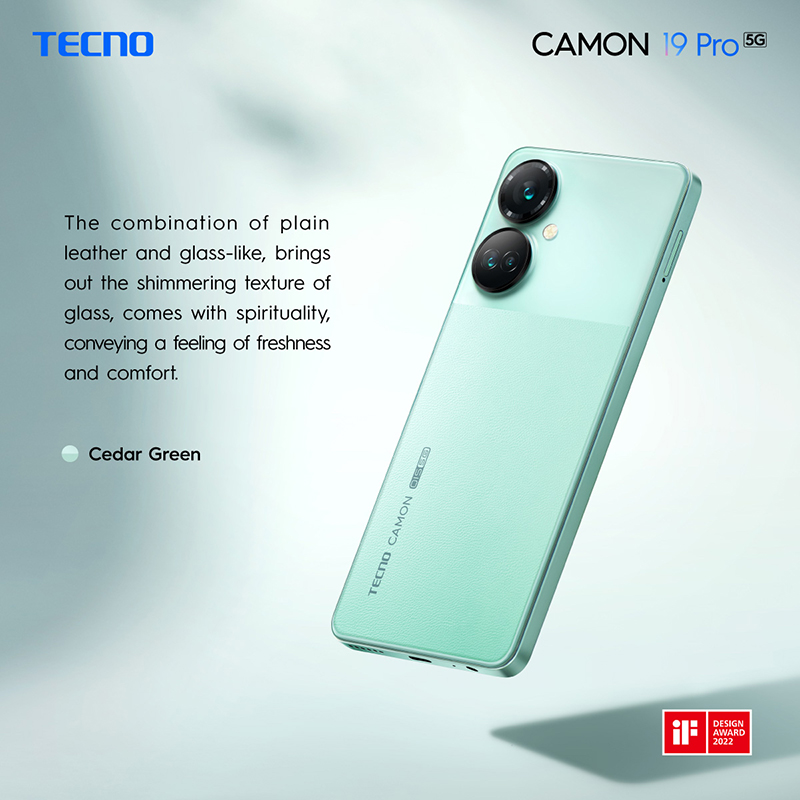 TECNO CAMON 19 PRO รุ่น 5G ใช้ชิปเซ็ต MediaTek Dimensity 810 5G ประสิทธิภาพแรงยิ่งกว่า หน่วยประมวลผล Arm Cortex-A76 ใน Octa-Core CPU สามารถทำความเร็วได้สูงสุดถึง 2.4GHz แสดงผลหน้าจอที่เร็วกว่ากับจอความถี่ 120Hz ดาวน์โหลดวิดีโอในไม่กี่วินาที วิดีโอคอลหรือเล่นเกมลื่นไหลไม่สะดุด รองรับเทคโนโลยีเกมมิ่ง HyperEngine 2.0 ของ MediaTek พร้อม NFC หรือ New Field Communication ซึ่งสามารถส่งผ่านข้อมูลได้แบบแตะแล้วอ่าน สำหรับใช้แทนกระเป๋าตังค์เพื่อชำระค่าโดยสาร ค่าอาหาร ฯลฯ กล้องหลัง 3 ตัว 64MP + 2MP + 2MP กล้องหน้า 16MP Pro ที่มีคุณสมบัติกล้อง AI ระดับไฮเอนด์ ให้สัมผัสอรรถรสทางสายตาชั้นเยี่ยมจากการปรับภาพด้วย AI-Bokeh และสัมผัสสีสันเต็มตาด้วย AI-Color พร้อมแฟลชทั้งกล้องหน้าและกล้องหลัง การันตีดีไซน์ที่หรูหราล้ำสมัยจนได้รับรางวัล iF Design Award 2022 ซึ่งเป็นหนึ่งในรางวัลการออกแบบเชิงอุตสาหกรรมที่ทรงอิทธิพลที่สุดในระดับโลกเมื่อเมษายน 2565 ที่ผ่านมา