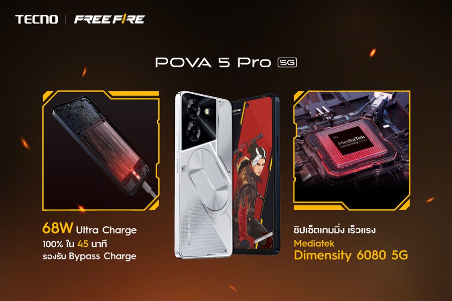 ถือว่ากินกันไม่ลงสำหรับ TECNO POVA 5 และ POVA 5 Pro สเปกดุเดือดไม่มีใครยอมใคร แถมยังทำราคาดีแบบตลาดแตกอีกต่างหากบอกเลยว่าคอเกมห้ามพลาด TECNO POVA 5 Series สมาร์ตโฟนเกมมิ่งรุ่นล่าสุดจาก TECNO Mobile ส่งมอบนวัตกรรมเกมมิ่งที่ดีที่สุดของแบรนด์พร้อมกับการจับมือกับ Free Fire อย่างเป็นทางการให้แฟนเกมฟินขั้นสุด ตัวเลือกที่ลงตัวสำหรับผู้ที่มองหาสมาร์ตโฟนใหม่ที่รู้ใจไลฟ์สไตล์อันเร็วแรง