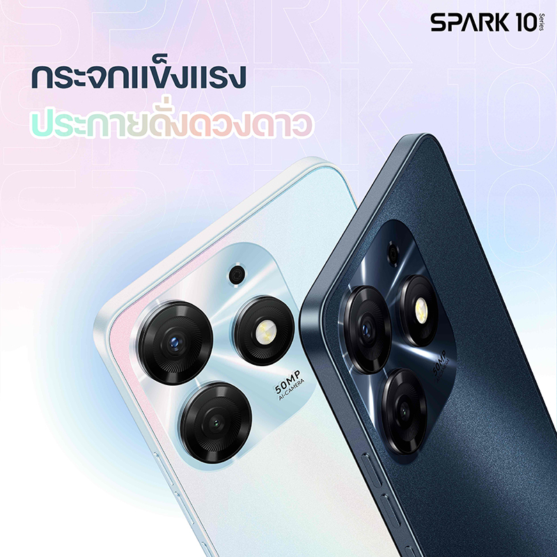 พบกับ SPARK 10 Series สมาร์ทโฟนแห่งปีที่คงเอกลักษณ์ด้วยการผสมผสานระหว่างนวัตกรรมการถ่ายภาพระดับ ช่างภาพมืออาชีพ สเปกเครื่องที่อัดแน่นด้วยเทคโนโลยีล้ำสมัย และมีดีไซน์รูปลักษณ์ที่สวยลงตัว โดย SPARK 10 Pro รุ่นความจุ 8GB + 128GB ราคา 4,499 บาท รุ่นความจุ 8GB + 256GB ราคา 4,799 บาท และ SPARK 10 รุ่นความจุ 4GB + 128GB ราคา 3,599 บาท รุ่นความจุ 8GB + 128GB ราคา 3,999 บาท (เฉพาะช่องทางออนไลน์เท่านั้น)