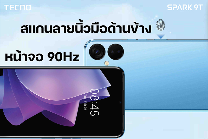 สมาร์ทโฟน TECNO SPARK 9T ติดตั้งเซนเซอร์สแกนลายนิ้วมือไว้ที่ข้างตัวเครื่อง ซี่งสะดวกและเร็วกว่าการติดตั้งไว้ที่จุดอื่นของตัวเครื่อง จอแสดงผลกว้างมากขึ้น หน้าจอ Ultra HD ขนาดใหญ่ 6.6” และอัตราการ รีเฟรชสูงที่ 90Hz การออกแบบหน้าจอที่เหมาะสม ช่วยให้ประสบการณ์การมองเห็นภาพดีขึ้น เลื่อนจอลื่นไหลลื่นและตอบสนองกับสัมผัสไวกว่า เพื่อความบันเทิงในการเล่นเกมและการดูวิดีโอ